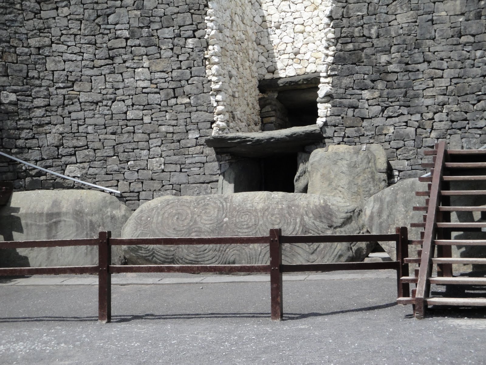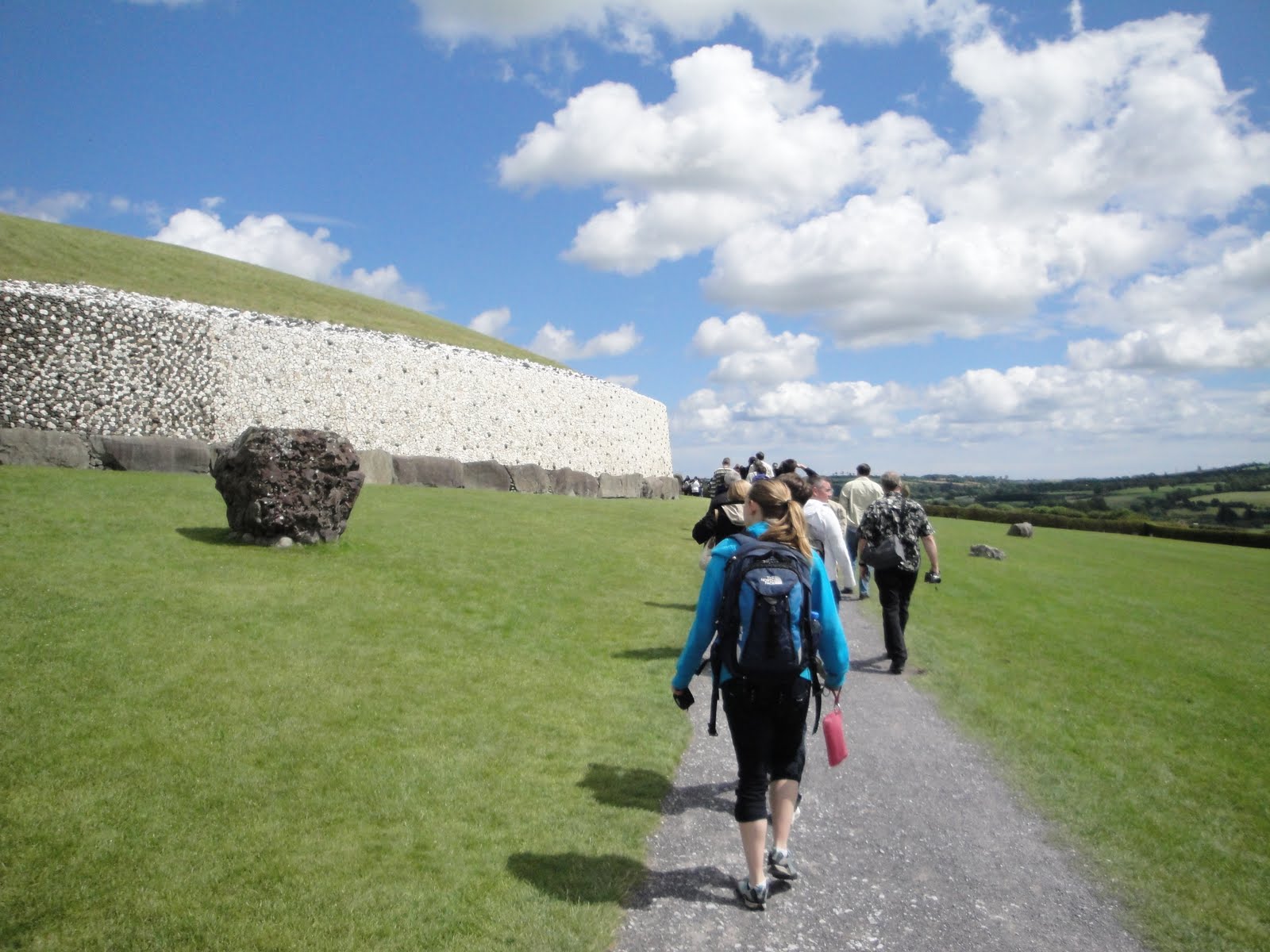 Lol, well we finally made our trip to Newgrange this past Saturday, and the tombs were over 5000 years old. They’re really old rocks. So apparently the tombs are built obviously for the dead, but also to follow the way the sun moves across the sky at a particualar point of the year. The architecture of the tombs were designed so that on the first day of summer when the sun rises, sunlight will enter the tomb and reunite their ancestors with the light of day. It’s a very interesting story. There are 3 tombs, the Newgrange tomb, the Knowth tomb, and the Dowth tomb. We only went to the newgrange tomb. Here’s what the tomb looks like on the outside: (note the tomb has been remodeled to look like what it used to be, but most the rocks inside the tomb are preserved…)
