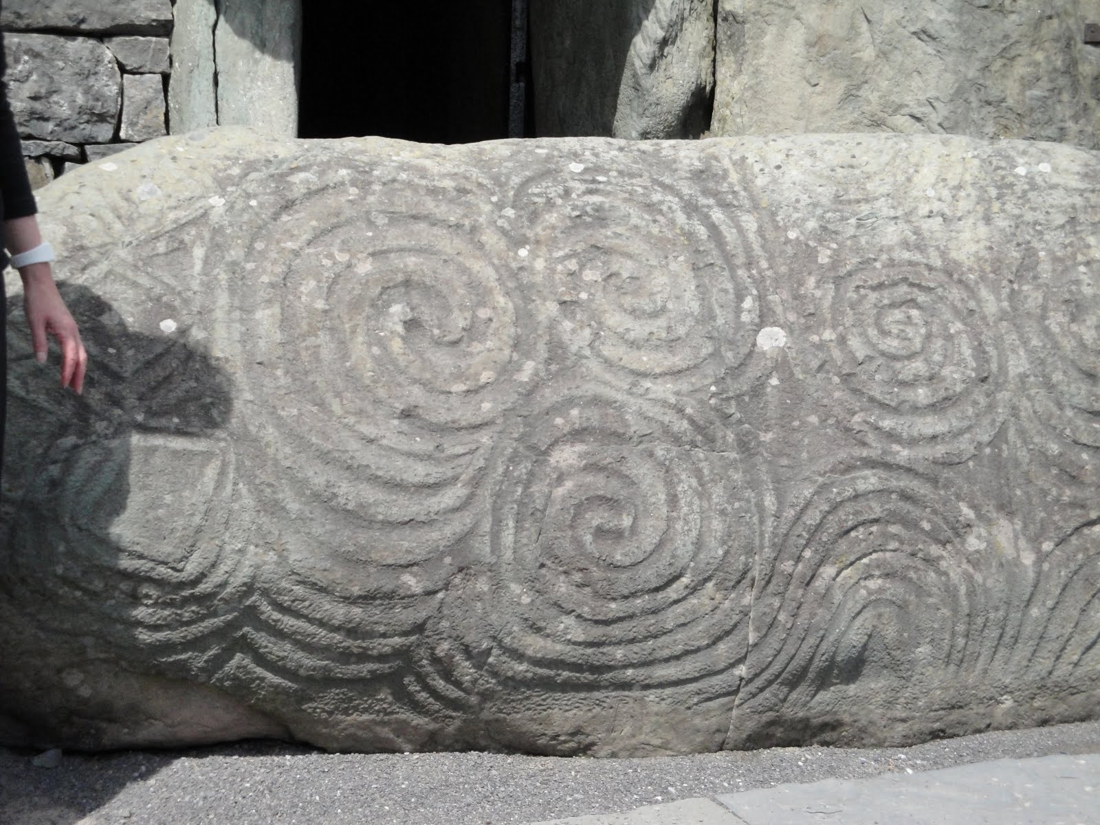 To the right is the entrance to the tomb (and as you can see those perfectly cut rock walls are probably made when it was remodeled) But the big stone with the swirly shapes are the art on the tomb entrance. The swirls represent the 3 tombs, and the artwork represent the map of the area.