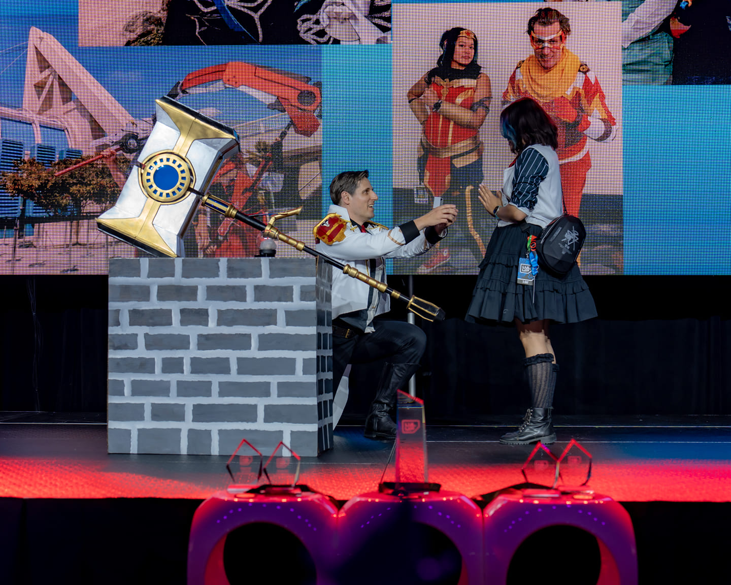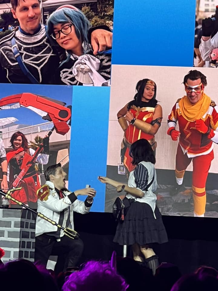 After his performance, Michelle went on to the stage to help clear the stage items, then suddenly the background music changed and the background slide itself changed to photos of them cosplaying at various different conventions together, and then Brendan popped the question with a ring in his cosplay props on stage! Michelle had a suspicion something was going down this weekend, so she carried Brendan’s ring with her in her bag all weekend long. She wanted to answer the question with her own ring for Brendan!
